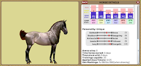 Drat, just 3 measly stat points short of being our Murphy and ending our 6/6 stallion drought. I was really tempted by this guy anyway, what with his awesome grullo coat without a single white marking and his great (albeit antisocial) personality. If his stats had been higher and if his avatar wasn't so similar to Teddy's (Julie's red roan AQH), I don't think I'd have been able to let him go. But, this morning, I sucked it up, wished him well, and put him in the Humane Society. He wasn't adopted immediately, but when Julie logged in about two hours later, she told me he was gone. Hopefully he found a good home!